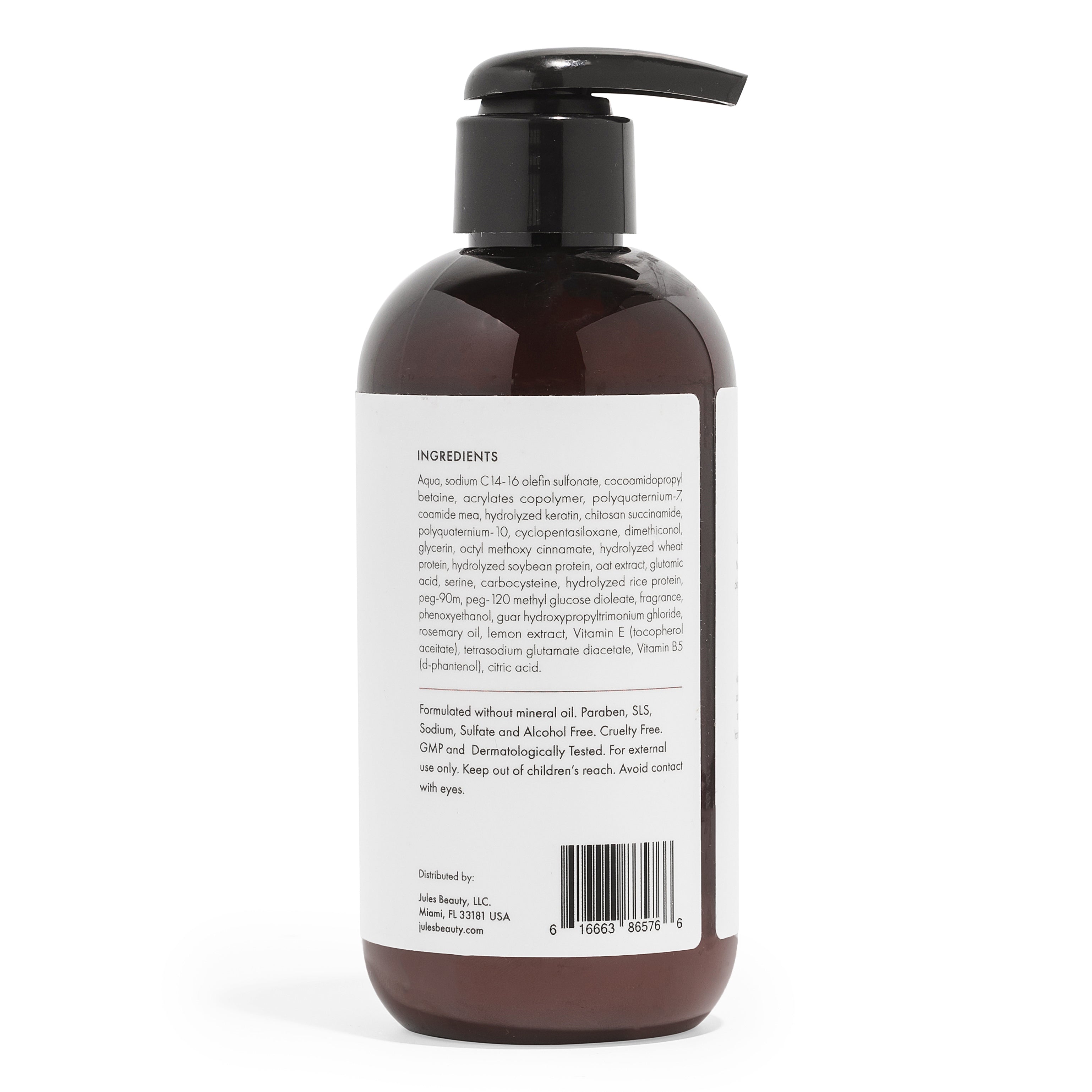 Aqua, sodium C14-16 olefin sulfonate, cocoamidopropyl betaine, acrylates copolymer, polyquaternium-7, coamide mea, hydrolyzed keratin, chitosan succinamide, polyquaternium-10, cyclopentasiloxane, dimethiconol, glycerin, octyl methoxy cinnamate, hydrolyzed wheat protein, hydrolyzed soybean protein, oat extract, glutamic acid, serine, carbocysteine, hydrolyzed rice protein, peg-90m, peg-120 methyl glucose dioleate, fragrance, phenoxyethanol, guar hydroxypropyltrimonium ghloride, rosemary oil, lemon extract, Vitamin E (tocopherol aceitate), tetrasodium glutamate diacetate, Vitamin B5 (d-phantenol), citric acid.