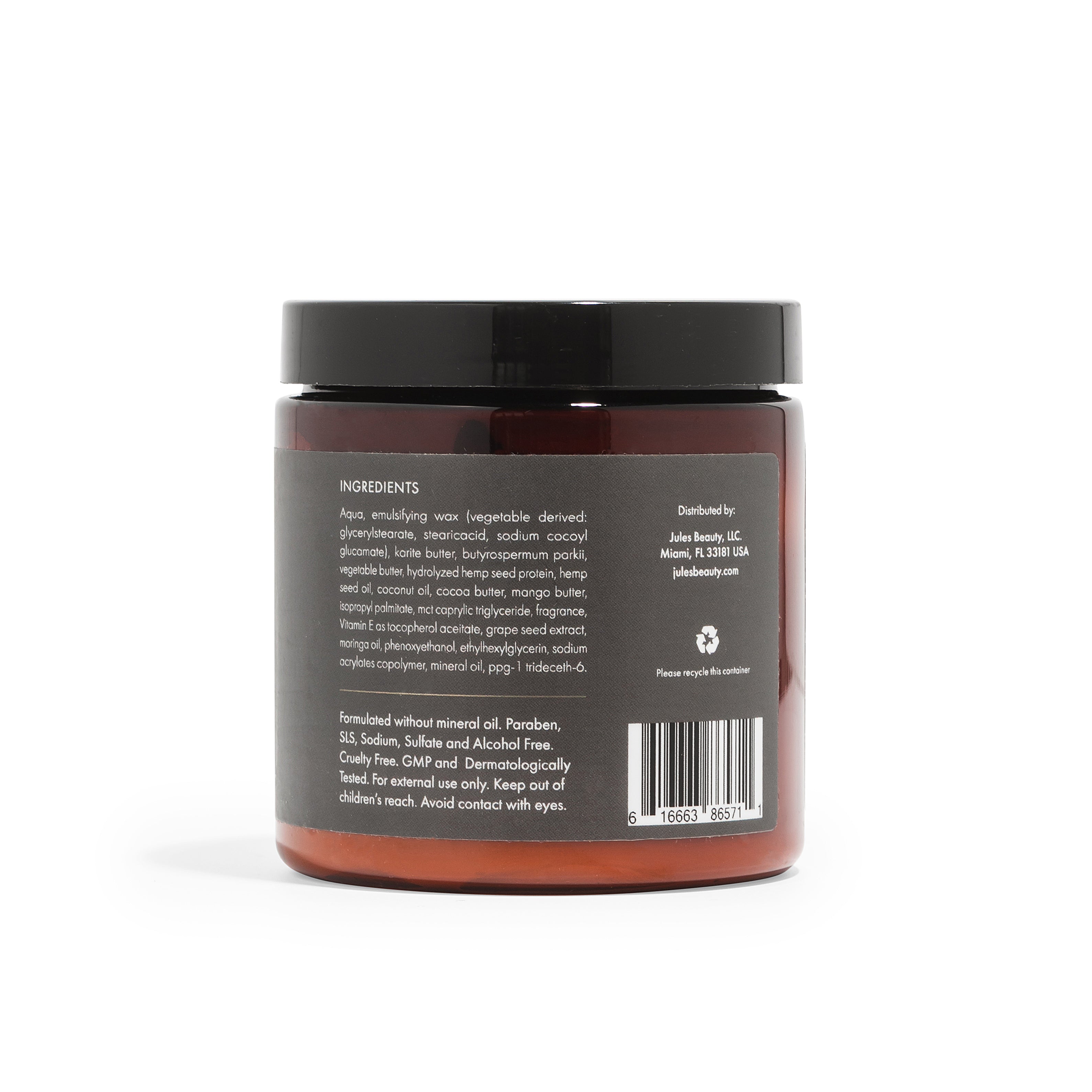 Aqua, emulsifying wax (vegetable derived: glycerylstearate, stearicacid, sodium cocoyl glucamate), karite butter, butyrospermum parkii, vegetable butter, hydrolyzed hemp seed protein, hemp seed oil, coconut oil, cocoa butter, mango butter, isopropyl palmitate, mct caprylic triglyceride, fragrance, Vitamin E as tocopherol aceitate, grape seed extract, moringa oil, phenoxyethanol, ethylhexylglycerin, sodium acrylates copolymer, mineral oil, ppg-1 trideceth-6.